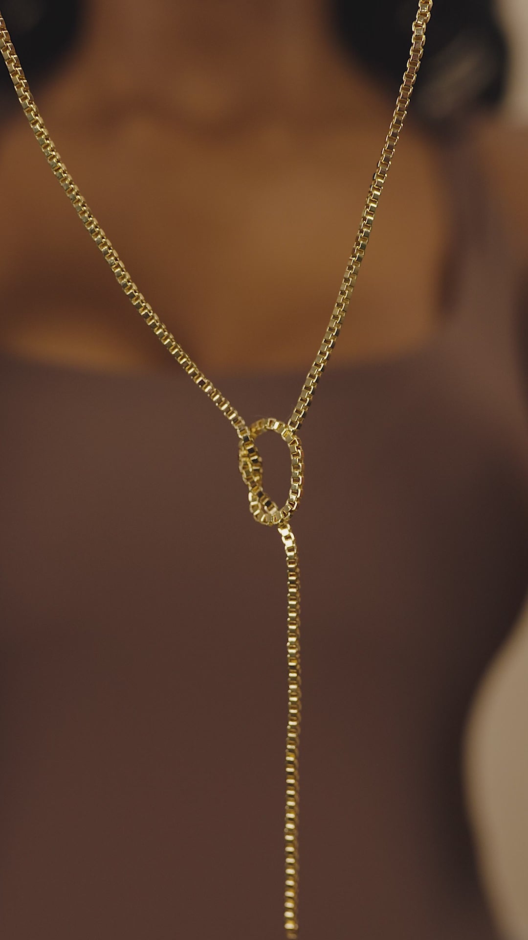 Features: 20" lariat necklace + 2 in extender with lobster clasp, 2.5mm thick box chain, soldered loop knot, 3 in drop from knot, lead and nickel free