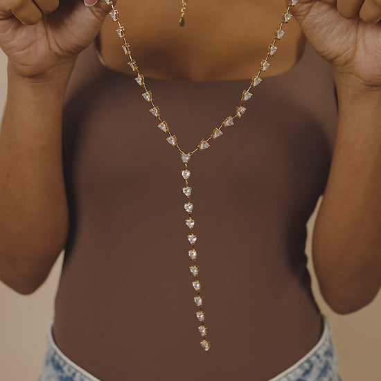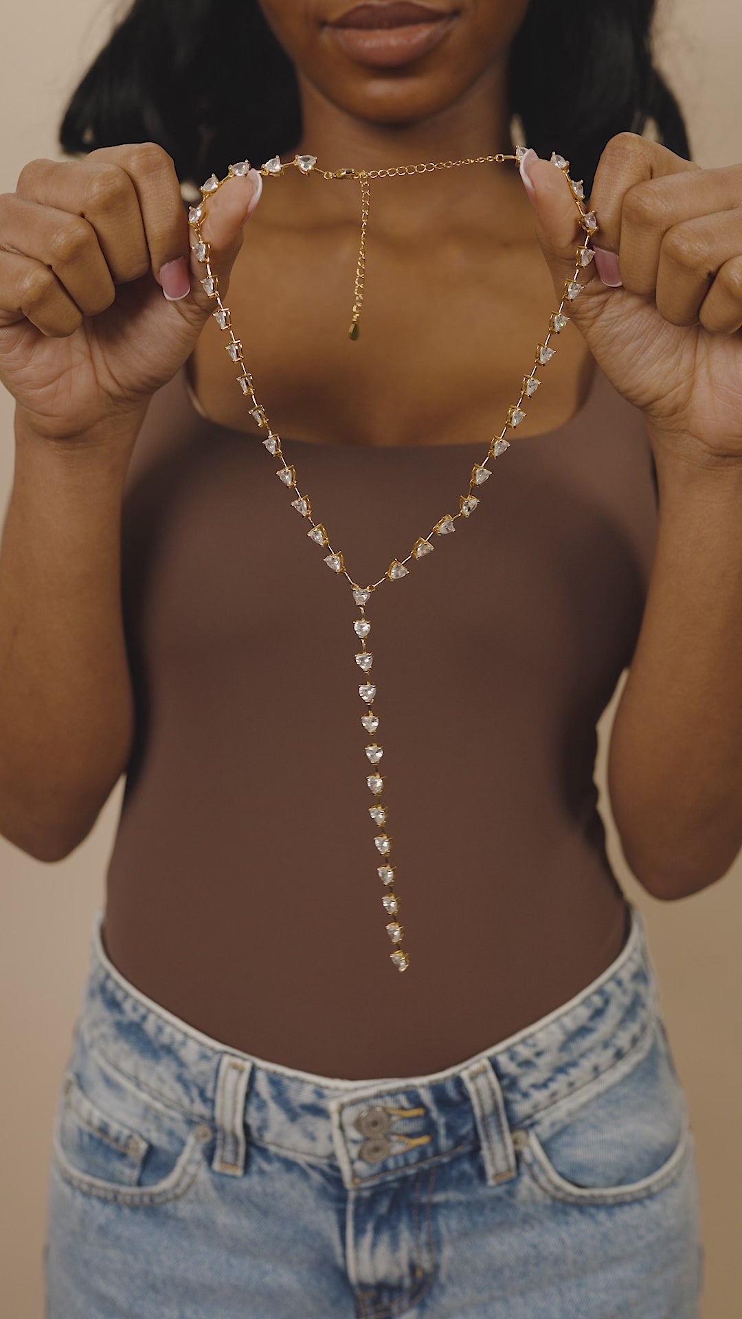 Indulge in luxury with our Tasha CZ Stationed Heart Lariat Necklace. The stunning CZ stationed heart design adds a touch of elegance, while the lariat drop adds a unique and sophisticated twist. Elevate your style and make a statement with this exquisite piece.