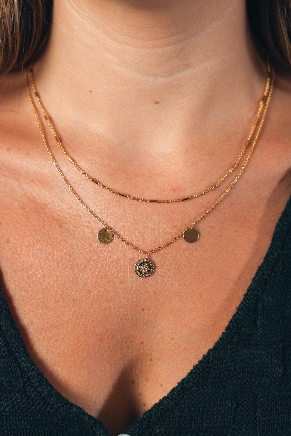 If you’re on your way to an interview for that dream job you’ve been fantasizing about forever, and you want to look your most professional (but maybe also as cute as you can be)? Nothing could be better than a pair of layered gold crescents. Elegant and understated, these bars will pull together a career look, but will also look just as good when you’re out celebrating your new job at brunch the next week. Who says layered necklaces can’t be multitaskers, too?