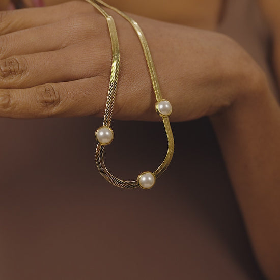 Elevate your style with our Pamela Stationed Pearl Herringbone Necklace. The intricate herringbone design and three stationed pearls add a touch of elegance to any outfit. Make a statement and exude luxury with this exclusive piece.