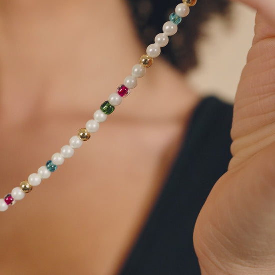 Material: 14K gold or rhodium plated brass, colored glass beads, freshwater pearls