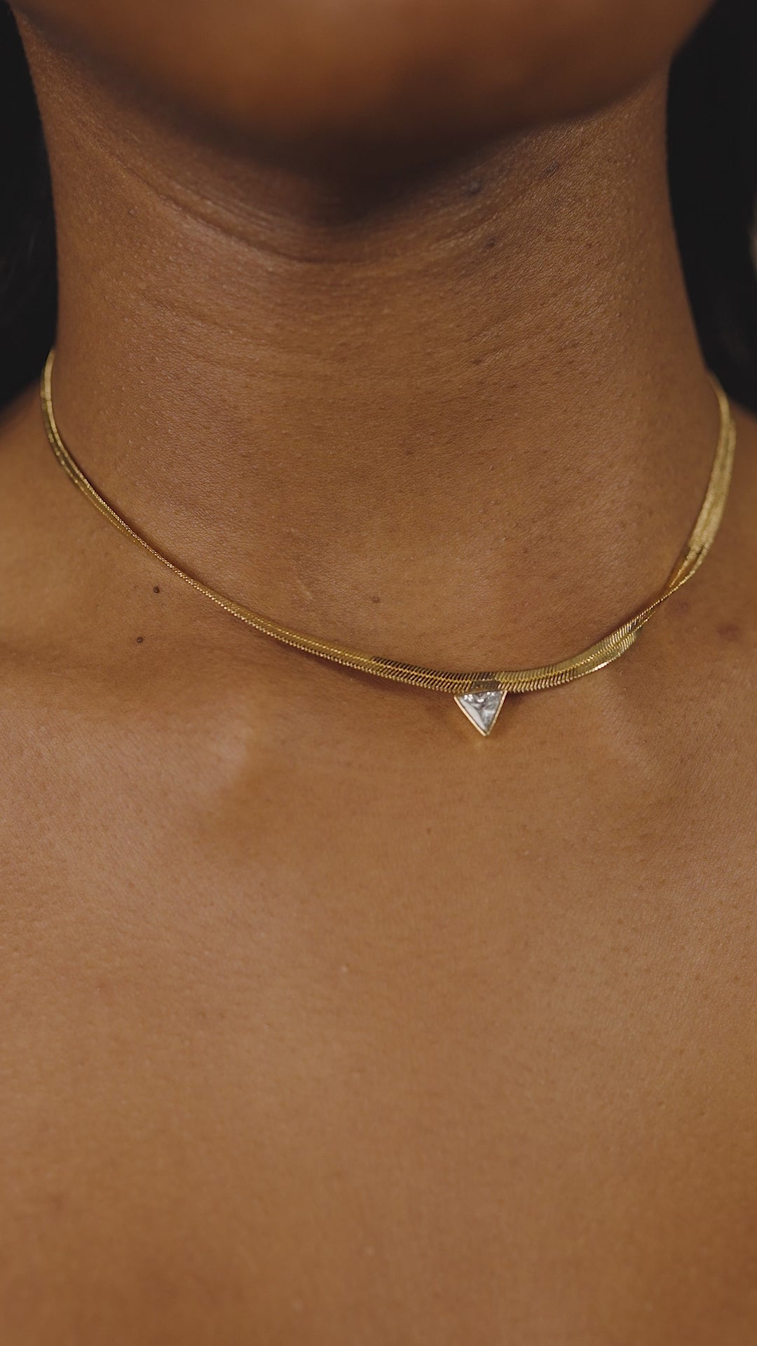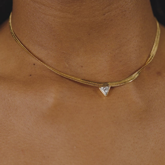Elevate your style with our Ruth CZ Pendant Herringbone Necklace. The sleek herringbone design exudes elegance, while the stationed CZ triangle adds a touch of glamour. Perfect for any occasion, this necklace will elevate any look with its understated yet sophisticated charm.