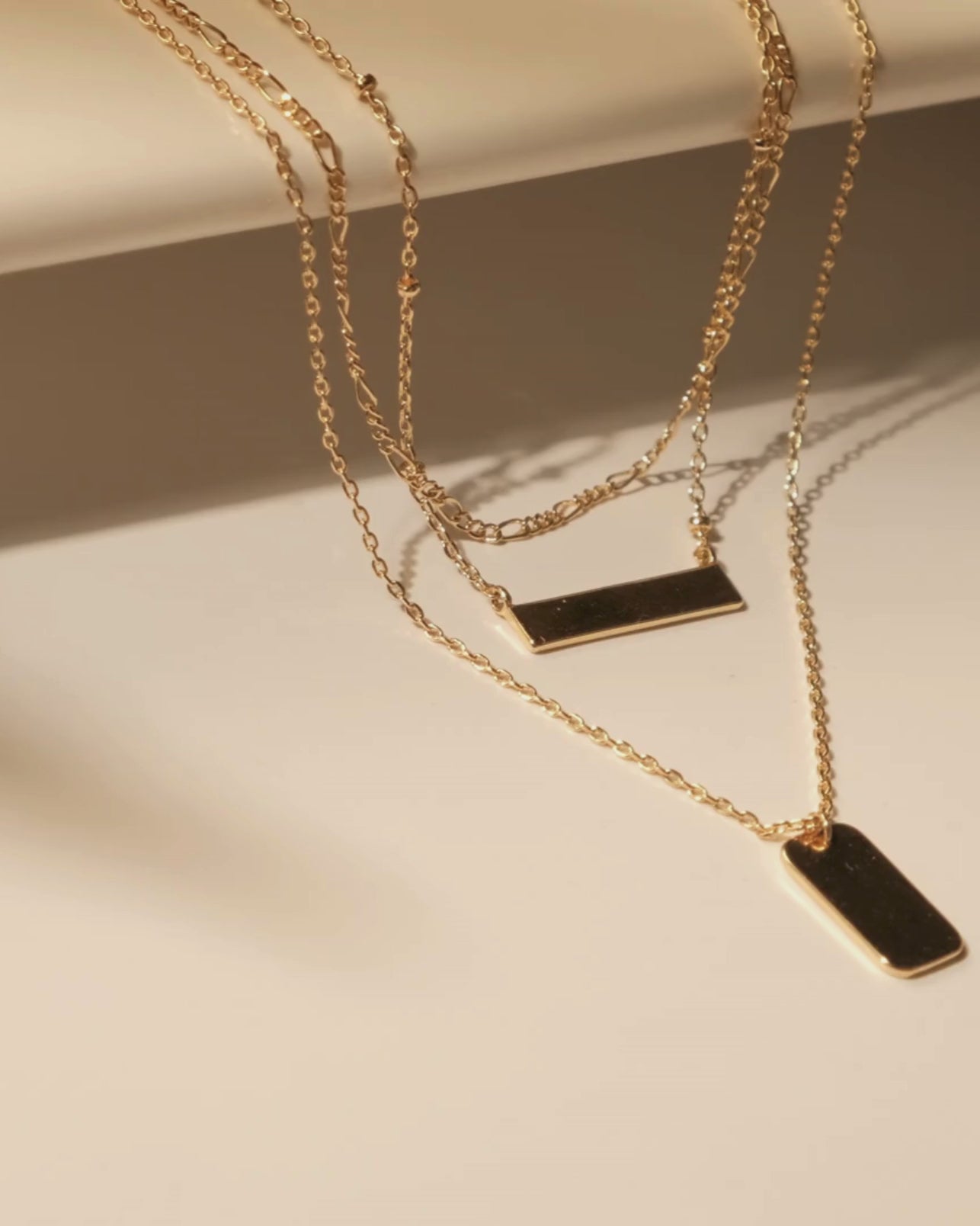 The layered look has never been so sleek or versatile! This triple layered bar necklace is perfect for anyone who wants to add a little shine to her look. Features a vertical and a horizontal smooth bar. Available in gold and silver tones.