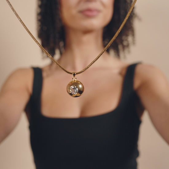 Elevate your look with our Zora CZ Dome Pendant Necklace. The polished circle pendant is adorned with a sparkling center cz, adding a touch of luxury to any outfit. The dome shape adds depth and dimension, making this a statement piece for the sophisticated and exclusive individual.